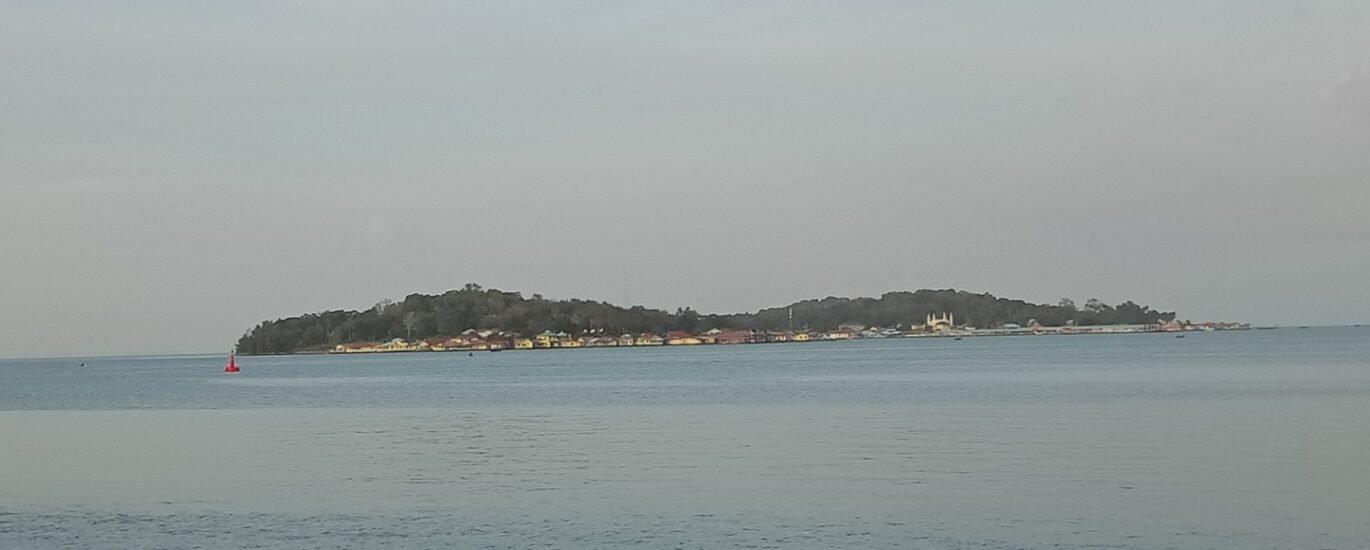 Hamparan laut yang luas dan tenang menyambut pandangan, dengan sebuah pulau kecil yang tampak anggun di kejauhan. Deretan rumah pesisir berwarna cerah berjajar rapi di sepanjang garis pantai pulau, menciptakan kontras yang indah dengan birunya laut dan langit yang membentang luas. Suasana ini menghadirkan ketenangan